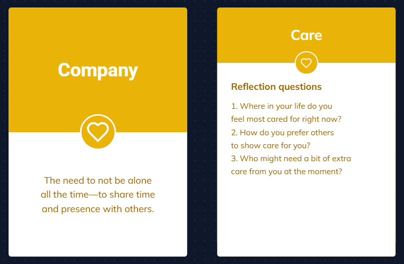 Use them to map the core needs of yourself or within the team and start a conversation around what matters most for different people, how this could create tension or misunderstanding, build empathy and look for solutions to address different needs. Use the reflection prompts on the back for further self-reflection or to start a meaning conversation and connection by sharing between team members.